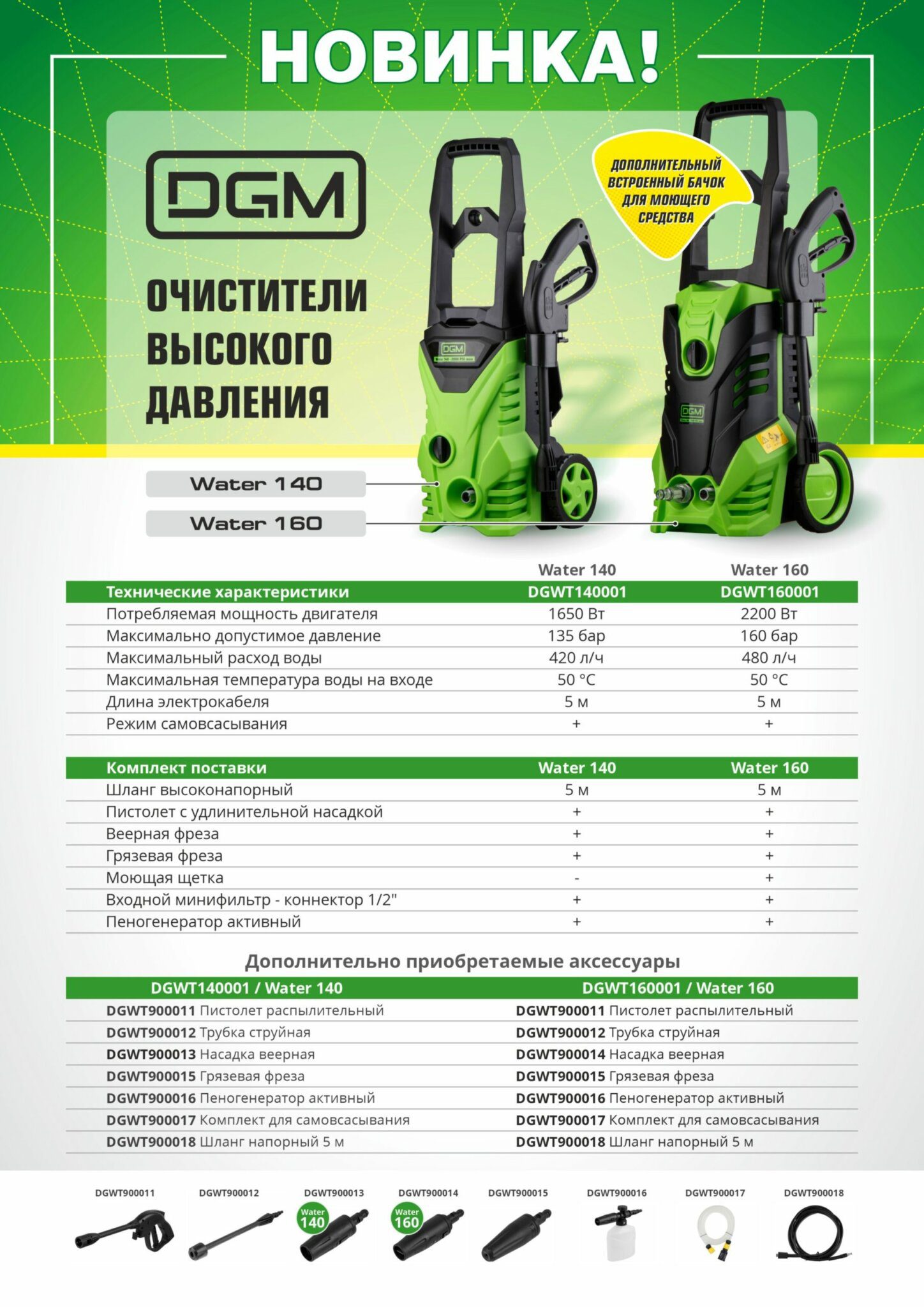 Мойка высокого давления DGM Water 140 (DGWT140001) с функцией самовсасывания, которая позволяет использовать очиститель без подключения к водопроводу. Алюминиевый корпус насоса высокого давления.
