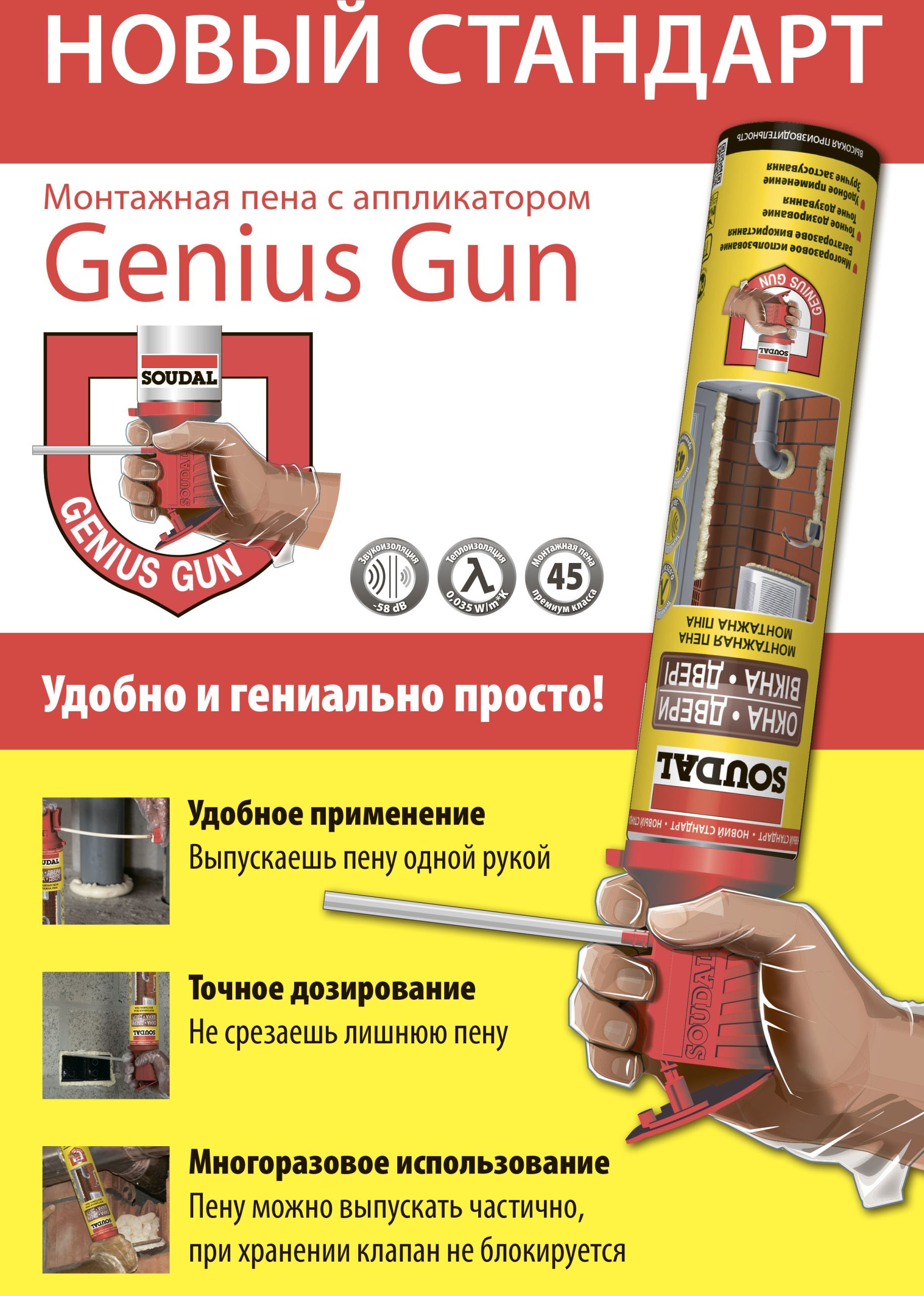 Пена монтажная SOUDAL Genius Gun Окна Двери 750 мл – монтажная пена многоразового использования c запатентованным аппликатором GENIUS GUN, благодаря которому пену можно выпускать частично, при хранении клапан не блокируется. Аппликатор дает возможность выпускать пену одной рукой, гарантирует точное дозирование, позволяет контролировать поток выпускаемой пены, что уменьшает ее расход – не нужно срезать лишнюю пену. Формула с низким расширением подходит для любых отделочных и монтажных работ. Отличная адгезия к дереву и древесным материалам, ПВХ, алюминию и другим металлам (в т.ч. покрытых лаком), бетону, кирпичной стене, глазурованной поверхности и т.д.