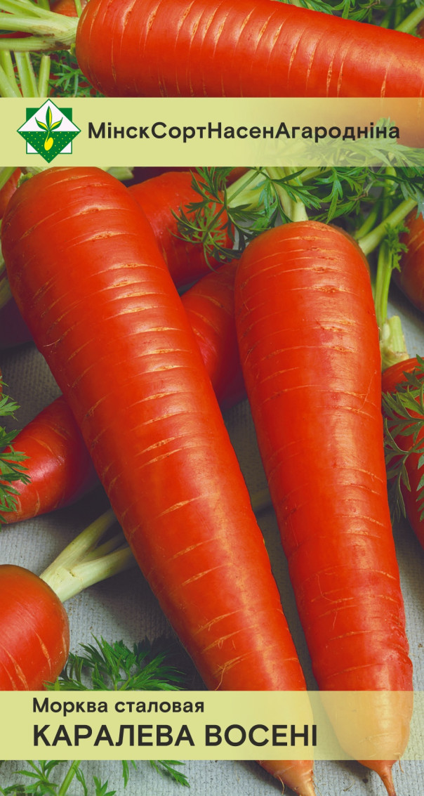 Семена моркови Королева осени столовая МИНСКСОРТСЕМОВОЩ 1,5 г – популярный поздний сорт. Очень урожайный. Корнеплоды полуконической формы, длиной 21-24 см, красно-оранжевой окраски, с небольшой сердцевиной оранжевого цвета. Вкусовые качества высокие. Отлично хранится до весны. Устойчив к болезням. Для потребления в свежем виде, переработки и хранения.
