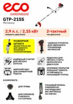 Мотокоса ECO GTP-215S Power (EC1514-2) с разборной штангой – диаметр 26 мм (состоит из двух частей). Многофункциональная и эргономичная рукоятка велосипедного типа. Эффективная антивибрационная система. Использование улучшенного (усиленного) ручного стартера с системой лёгкий запуск. Цельнометаллический приводной вал. Редуктор повышенной прочности. Топливный бак с полупрозрачными стенками. Праймер (система лёгкого запуска). Ударопрочный корпус двигателя. Комбинированный защитный кожуху из прочного пластика. Усиленная полуавтоматическая косильная катушка с леской. Прочный трехлопастной нож. Двухплечный ремень для большего комфорта при работе. Два поршневых кольца для высокой компрессии.