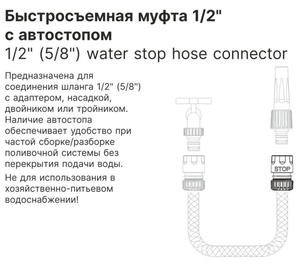 Муфта быстросъемная 1/2″ STARTUL Garden (ST6011-3-1/2) используется для соединения шланга с насадкой, адаптером, двойником (тройником). При снятии насадки подача воды из шланга прекращается – это функция автостопа, которая позволяет менять поливочные насадки или переходить на другое место полива без перекрытия подачи воды. Кроме того муфту можно использовать со шлангом 5/8″ без дополнительных переходников.