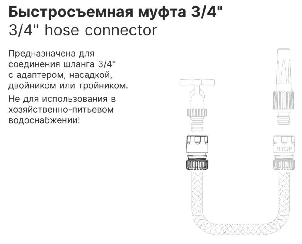 Муфта быстросъемная 3/4″ STARTUL Garden (ST6011-4-3/4) используется для соединения шланга с насадкой, адаптером, двойником (тройником). Муфта изготовлена из пластика и не подвержена коррозии.