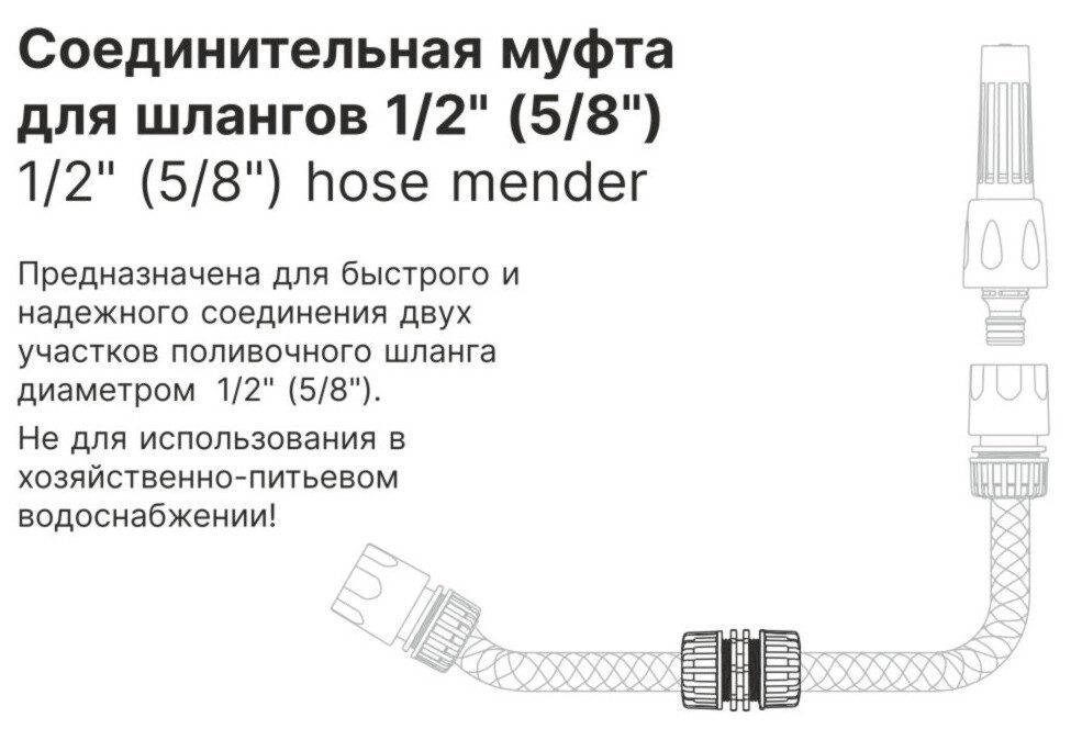 Муфта соединительная для шлангов 1/2″ (5/8″) STARTUL GARDEN предназначена для соединения двух шлангов (1/2″ с 1/2″ или 1/2″ с 5/8″ или 5/8″ с 5/8″) с целью получения водопровода большей длины или соединения двух частей одного лопнувшего шланга. Муфта выполнена из пластика и не подвержена коррозии.