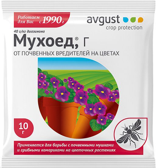 Инсектицид Мухоед Г AVGUST 10 г – незаменимое средство для борьбы с почвенными вредителями на цветочных растениях. Удобен в применении – препарат полностью готов для внесения в почву. Уничтожает личинки и взрослых насекомых. Быстро разлагается и не накапливается в почве. Не оказывает отрицательного влияния на растения. Применятся путем внесения на поверхность почвы вокруг растений с последующим рыхлением. Рекомендованное количество обработок: 1.