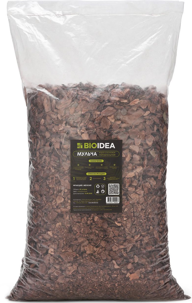 Мульча сосновой коры BIOIDEA мелкая фракция 0,7-3 см содержит небольшое количество щепы. Кора мелкой фракции подходит для мульчирования маленьких кустарников, цветов на клумбах и палисадниках. Мульчу мелкой фракции можно использовать как подложку под кору более крупной фракции. Срок службы данной фракции составляет около 2-3 года, при этом перегнивая, она превращается в гумус и улучшает состав почвы. Средний расход на 1 кв.м – 50 литров при высоте мульчирования 4-5 см.