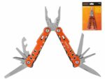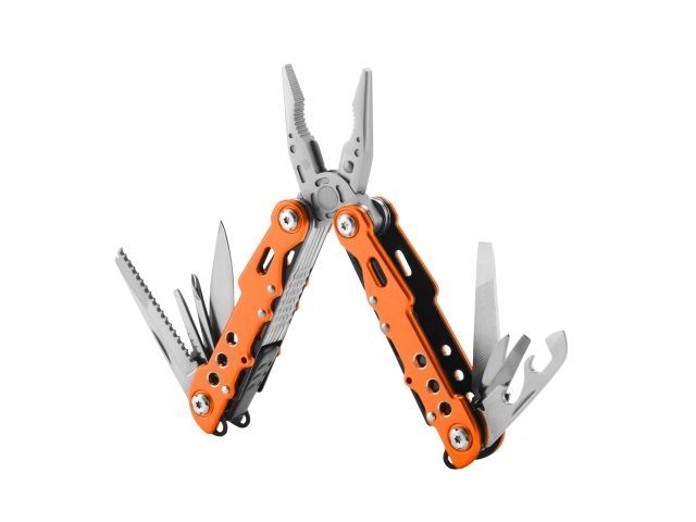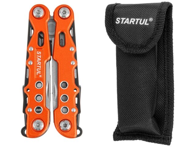 Мультитул STARTUL Profi (ST9503-13) – это компактный многофункциональный инструмент с авторазжимом, который может применяться для выполнения широкого набора функций. Он включает в себя 13 функций: тонкогубцы, плоскогубцы, кусачки для проводов, нож, отвертка PH, 3 плоские отвертки 3 мм, 4,5 мм, 6,5 мм, пила, напильник двусторонний, плоское лезвие-пробойник, консервный нож и открывалка для бутылок. Инструменты выполнены из нержавеющей стали 1.3CR13 с зеркальной полировкой, рукоятка из анодированного алюминия. Для удобного хранения и транспортировки предусмотрен чехол. Общая длина инструмента 16,5 см, в сложенном состоянии – 10,5 см.