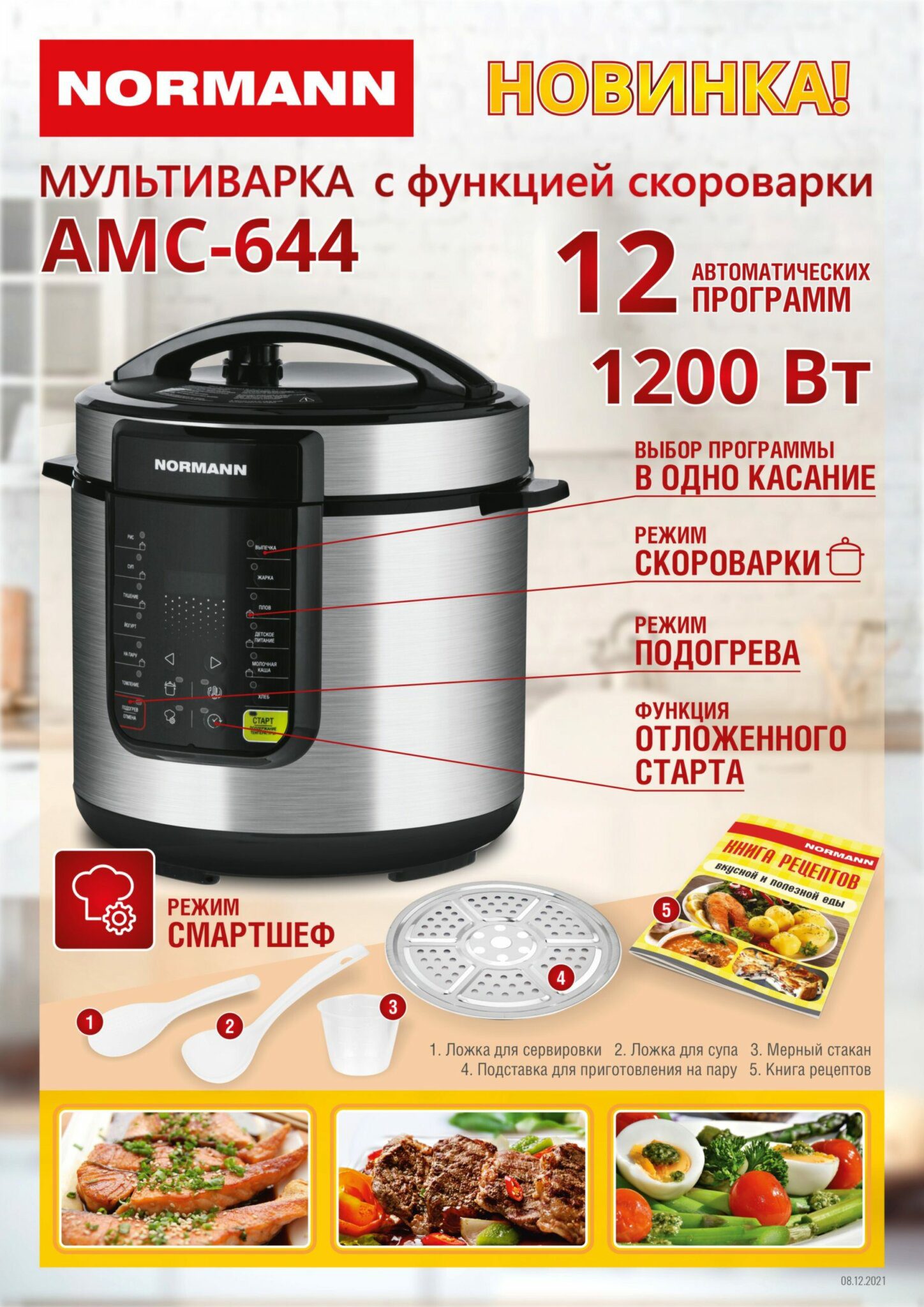 Мультиварка-скороварка NORMANN AMC-644 представляет собой мультиварку-скороварку. Продукты готовятся под давлением и без доступа кислорода, в результате чего сохраняется больше витаминов и минеральных веществ, при этом сохраняется исходный вкус продуктов, а также ускоряется процесс приготовления. 12 автоматических программ. Режим скороварки (приготовление под давлением) – 7 программ. Режим мультиварки – 5 программ. Запуск режима в одно нажатие. Функция Смартшеф для ручной настройки. Блокировка открытия крышки во время приготовления. Внешняя поверхность из нержавеющей стали. Съемная чаша 6 литров с антипригарным покрытием Daikin (Япония). Приготовление на пару (корзина в комплекте). Функция отложенного старта. Режим подогрева. Книга рецептов в комплекте.