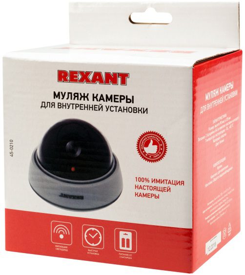Муляж камеры видеонаблюдения REXANT белый (45-0210) с мигающим каждые 5 секунд красным светодиодом предназначен для иммитации действующей системы видеонаблюдения внутри частных помещений. Неотличим от обычной камеры. Питание от 2 элементов типа АА. Материал исполнения – пластик. В комплекте: камера, шурупы крепления, наклейка “Ведется видеонаблюдение”.