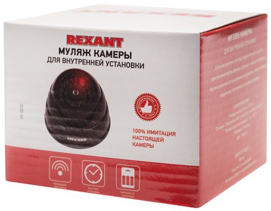 Муляж камеры видеонаблюдения REXANT черный (45-0230) с мигающим каждые 5 секунд красным светодиодом предназначен для иммитации действующей системы видеонаблюдения внутри частных помещений. Неотличим от обычной камеры. Питание от 3 элементов типа ААА. Материал исполнения – пластик. В комплекте: камера, шурупы крепления, наклейка “Ведется видеонаблюдение”.