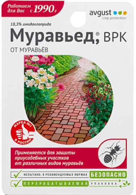 Инсектицид AVGUST Муравьед 11 мл — препарат контактно-кишечного действия. Применяется на приусадебных участках, отмостках домов, в щелях между садовыми плитами. Он попадает в организм насекомых, оказывая губительное влияние на их нервную систему: вызывает торможение мышечной деятельности, судороги, а затем полный паралич. Положительные особенности препарата — отсутствие привыкания к нему муравьев и экономичный расход. Муравьи исчезают в течение не более трех суток после обработки. Защитный эффект сохраняется на протяжении не менее 3 недель.