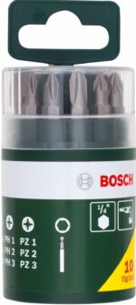 Набор бит с универсальным держателем 9 предметов BOSCH (2607019454) для работы с крепежом при строительных и ремонтных работах. Высококачественные биты для заворачивания стандартных шурупов со шлицем Phillips, Pozidriv и «прямой». Магнитный универсальный держатель для быстрой смены бит и оптимальной фиксации шурупа в бите. Для электроинструментов любых марок и ручных отверток.
