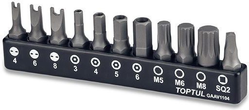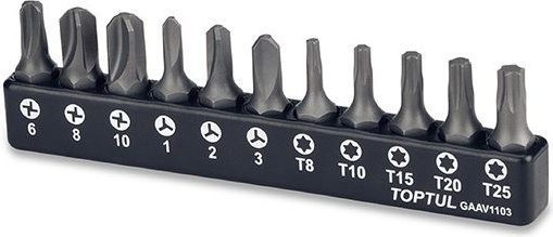 Набор бит 11 предметов TOPTUL (GAAV1103) содержит 3 шлица TORQ-SET 6, 8, 10 мм, 3 шлица TRI-WING 1, 2, 3 мм и 4 биты TORX T8, T10, T15, T20, T25.