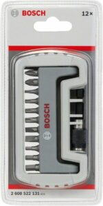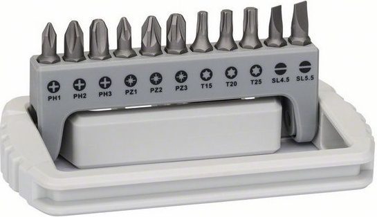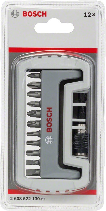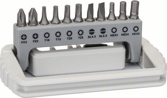 Набор бит с быстросменным держателем 12 предметов BOSCH Pro Line (2608522131) для работы с крепежом при строительных и ремонтных работах. Длина бит 25 мм, ISO 1173 C6.3, с быстросменным универсальным держателем. Содержимое набора: PH2; PZ2; T10, T15, T20, T25; S0,6×4,5, S0,8×5,5; HEX3, HEX4, HEX5.