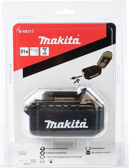 Набор бит 31 предмет MAKITA (B-68317) состоит из: PH0, PH1, PH2, PH3, PZ0, PZ1, PZ2, PZ3, T10, T15, T20, T25, T27, T30, T40, HEX3, HEX4, HEX5,1 HEX6, SL0.6×4.5, SL0.8×5.5, SL1.2×6.5. Держатель для бит.