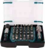 Набор бит 32 предмета MAKITA (D-65084) используется совместно с гайковертами и шуруповёртами при работе с крепежом. Магнитный держатель предназначен для надежной фиксации бит. Набор поставляется в удобном пластиковом футляре с прозрачной крышкой. Содержит 30 бит востребованных размеров, адаптер на 1/2″ и держатель для бит C-form. В набор входят биты 25 мм: SL4, SL6, PH0, PH1-2 шт., PH2 – 4 шт., PH3 – 2 шт,PZ1 – 2 шт., PZ2 – 3 шт., PZ, T10, T15, T20 – 2 шт., T25 – 2 шт., T27, T30, T40, HEX3, HEX4, HEX5, HEX6. Адаптер 1/2 – 1/4″ E-form (MZ) Хвостовик E-form (MZ) 60 мм: 1 шт; Держатель для бит C-Form Хвостовик E-form (MZ) 60 мм: 1 шт.