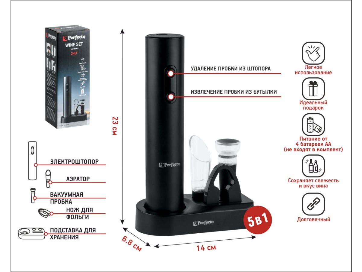 Набор для вина PERFECTO LINEA Chef 5 предметов (39-022505) – это стильное и функциональное решение для любителей благородных напитков. В комплект входит всё необходимое, чтобы процесс подачи вина стал максимально комфортным и эстетичным.