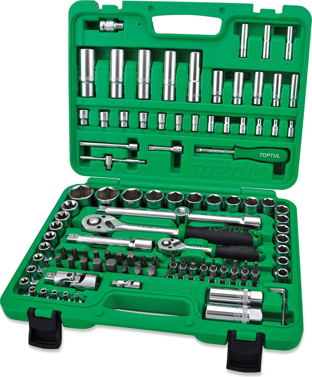 Набор торцевых шестигранных головок и бит TOPTUL на 1/4″ и 1/2″ состоит из 108 предметов. Рекомендуется для профессионального использования.