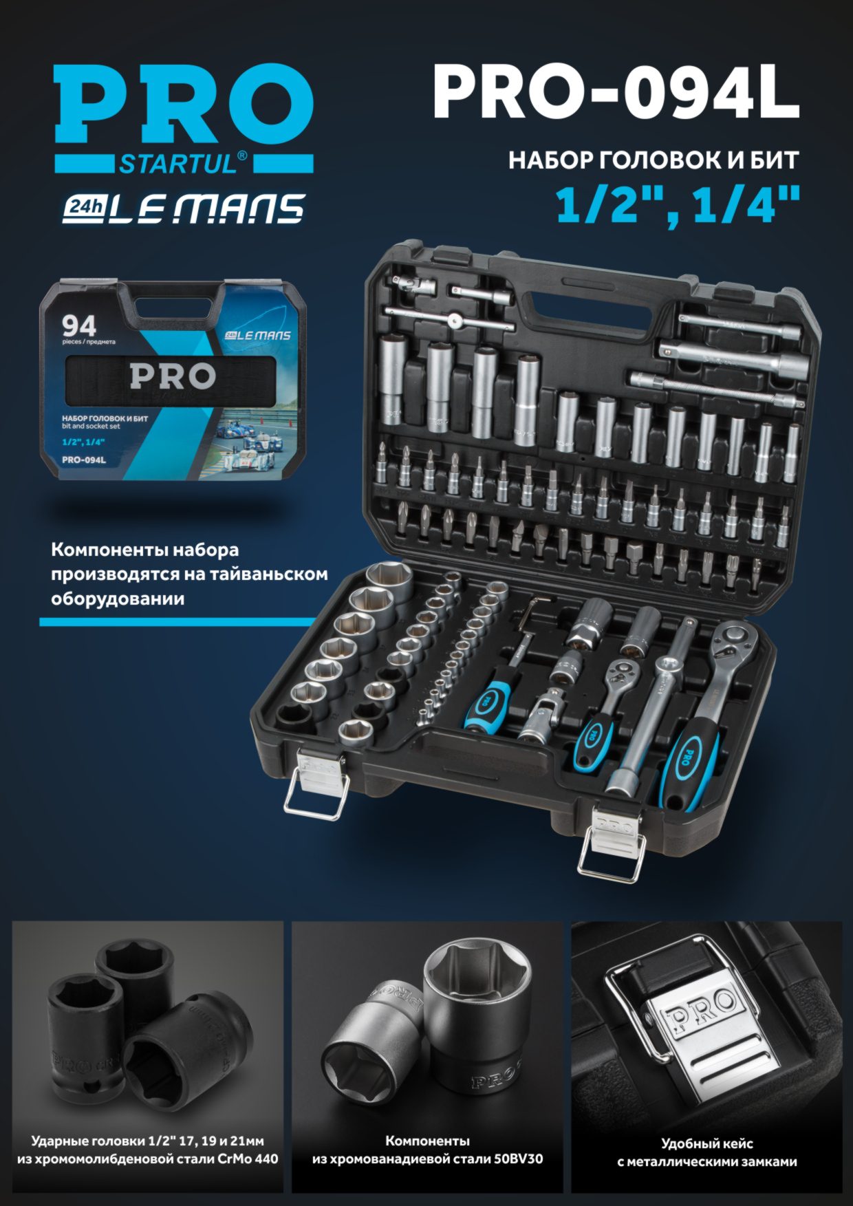 Набор инструментов 1/4″, 1/2″ 6 граней 94 предмета PRO STARTUL Le Mans (PRO-094L) – многофункциональный набор предназначен для ремонта и обслуживания автомобиля. Рабочие части изготовлены из хромованадиевой стали, устойчивы к коррозии, ударные головки 1/2″ 17, 19, 21 мм изготовлены из хромомолибденовой стали. Финишная обработка головок – сатинирование. Трещоточный механизм 45 зубьев. Кейс изготовлен из прочного противоударного пластика, с металлическими замками.