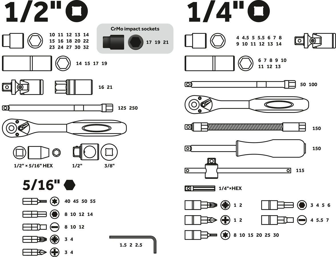 | Удлинители | 1/4′ 50 мм, 100 мм, 150 мм (гибкий) 1/2′ 125 мм, 250 мм |