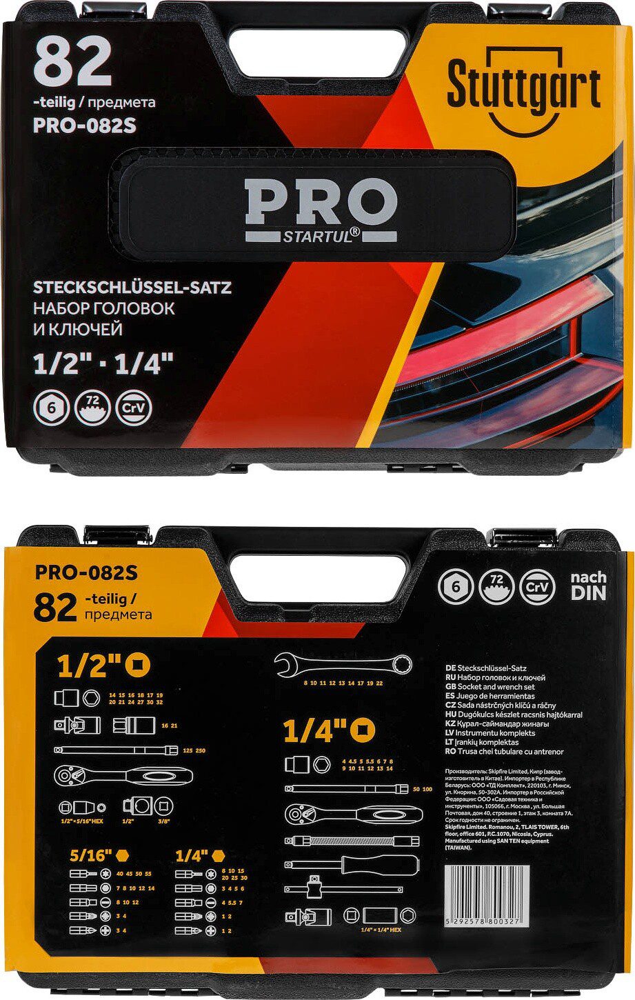 Набор инструментов 1/4″, 1/2″ 6 граней 82 предмета PRO STARTUL Stuttgart (PRO-082S) – это незаменимый инструмент для работ любых сложностей, который всегда должен быть под рукой. Набор способен выдерживать большие нагрузки, что обеспечивает надежность и долговечность. Широко применяется как для личных так и для коммерческих целей: в гараже у автолюбителя, на небольшом СТО или крупнейших автосервисах и даже на производстве.