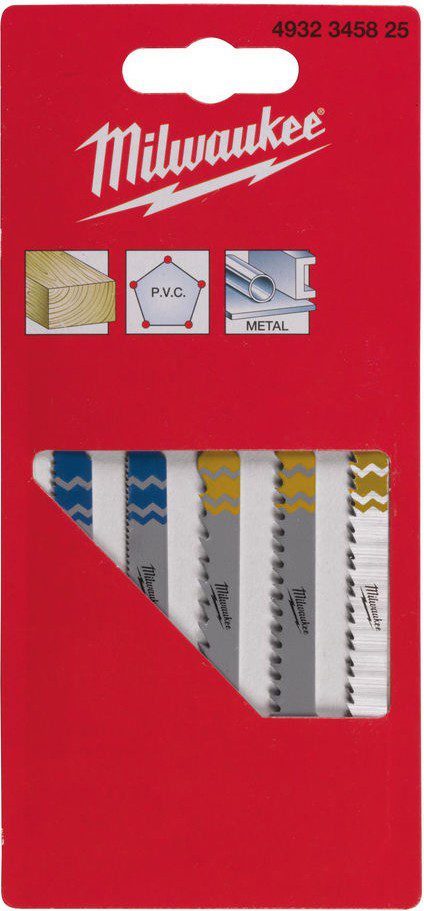 Набор пилок для лобзика MILWAUKEE 5 штук (4932345825) включает в себя лобзиковые полотна: Полотно 4932213116 – 75х4 мм, T144D, по дереву, прямой грубый рез; Полотно 4932254061 – 75х2,5 мм, T101B, по дереву, ДПС, ПВХ, прямой чистый рез;Полотно 4932254063 – 55х1,2 мм, T118A, по стали, цветному металлу, прямой чистый рех;Полотно 4932254064 – 55х2 мм, T118B, по металлу, прямой чистый рез;Полотно 4932254071 – 75х3 мм, T111C, по дереву, прямой грубый рез.
