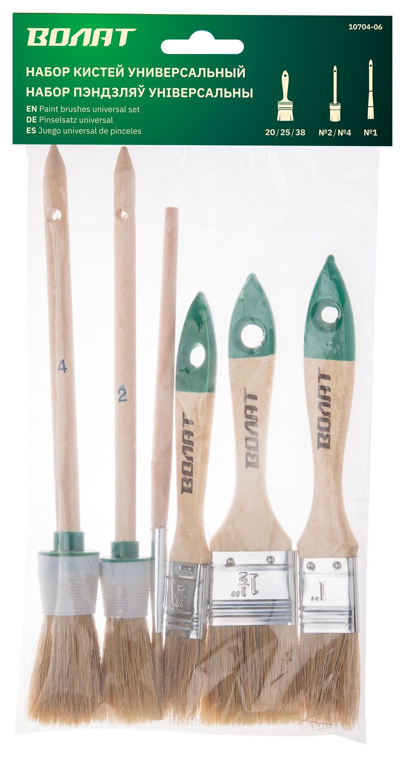 Набор кистей ВОЛАТ 6 предметов (10704-06) используется для малярных работ, нанесения лаков и масляных красок. Состав набора: плоские кисти 20 мм (3/4″), 25 мм (1″), 35 мм (1,5″), круглые №2, №4, корректирующая кисть №10. Тип щетины – натуральная светлая щетина.