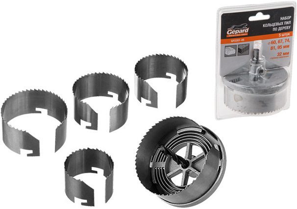 Набор пильных коронок по дереву 5 предметов GEPARD (GP2201-05) применяется для пиления отверстий в дереве, фанере, ДСП, пластике и гипсокартоне при установке распределительных коробок, электророзеток, потолочных светильников и т.д. Используется в качестве сменной насадки для дрелей в режиме сверления без удара. Зубья пилы закалены и разведены с постоянным шагом. Жёсткость пилы и точность сверления обеспечиватся при помощи центровочного сверла. Удаление продуктов пиления происходит через боковую прорезь. Диаметр коронок 60, 67, 74, 81, 95 мм. Глубина сверления 32 мм.