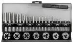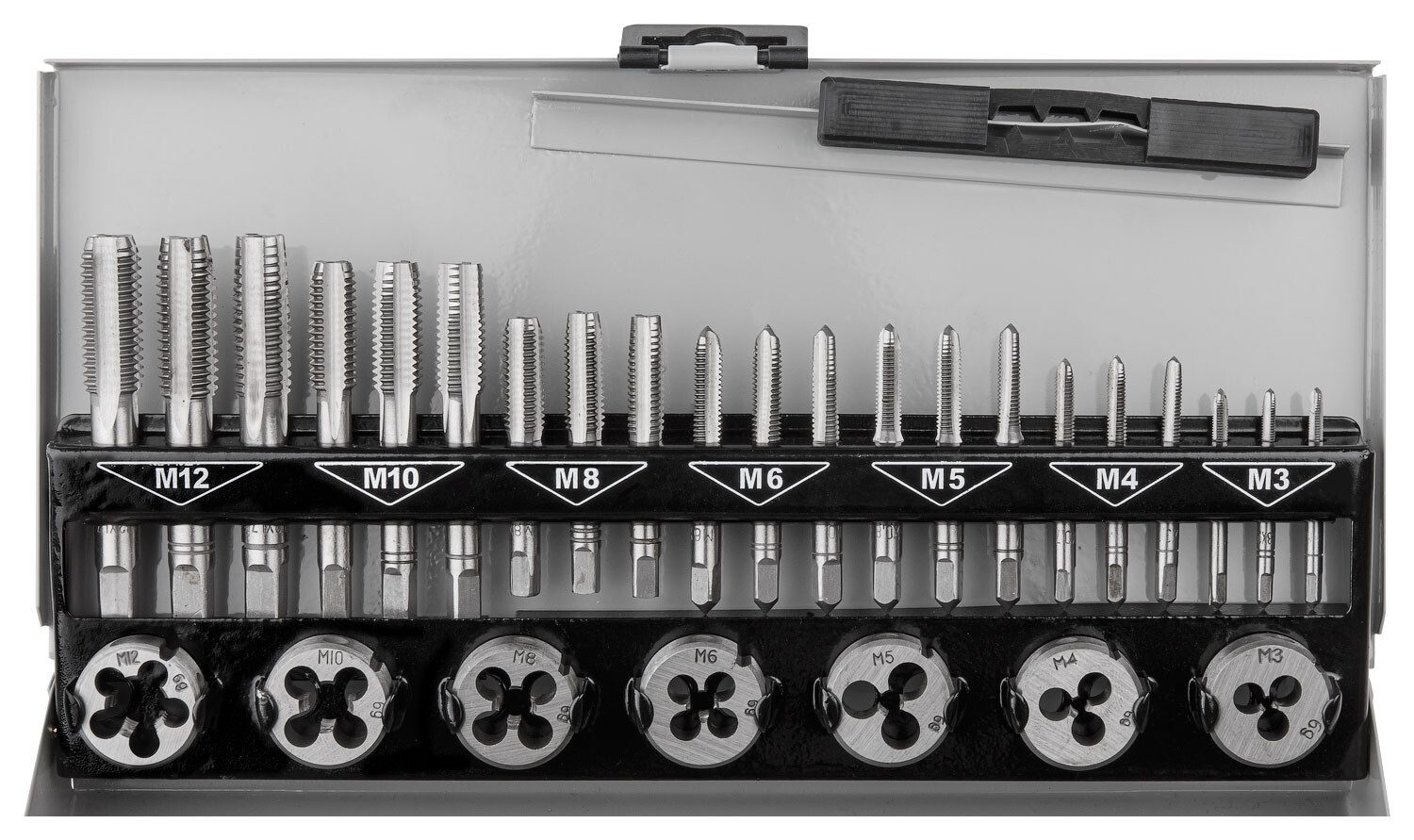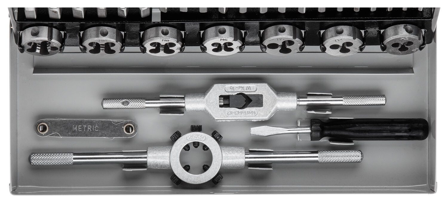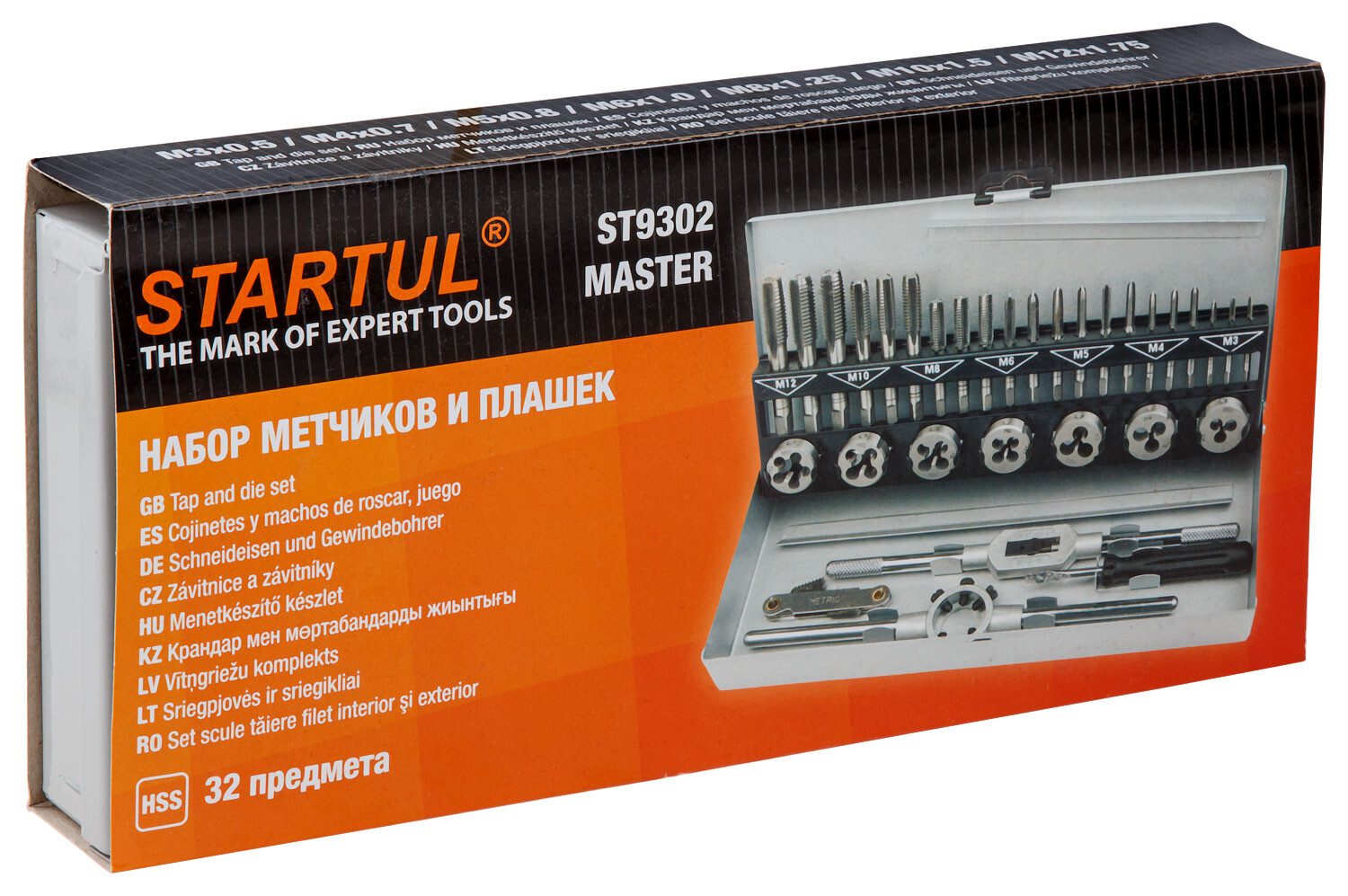 Набор метчиков и плашек 32 предметов STARTUL Master (ST9302) металлорежущего инструмента используется для нарезания внутренней и внешней резьбы на металлических заготовках. Все предметы набора изготовлены из инструментальной легированной стали. В набор входят плашки: М3 х 0,5 / М4 х 0,7 / М5 х 0,8 / М6 х 1,0 / М8 х 1,25 / М10 х 1,5 / М12 х 1,75; метчики: 7 комплектов №1, №2, №3 с резьбой М3 х 0,5 / М4 х 0,7 / М5 х 0,8 / М6 х 1,0 / М8 х 1,25 / М10 х 1,5 / М12 х 1,75; метчикодержатель, плашкодержатель, резьбомер, отвертка.