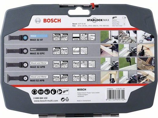Набор оснастки для многофункционального инструмента BOSCH (2608664132) подходит для монтажных работ. В состав набора входят: Полотно пильное погружное BOSCH HCS MAIZ 32 EPC Wood.Полотно пильное погружное BOSCH BIM MAIZ 32 APB Wood and Metal.Полотно пильное погружное BOSCH BIM MAII 52 APB Wood andMetal.Полотно пильное погружное BOSCH Carbide MAIZ 32 AT Metal.Для нового поколения GOP/PMF c системой StarlockMax.