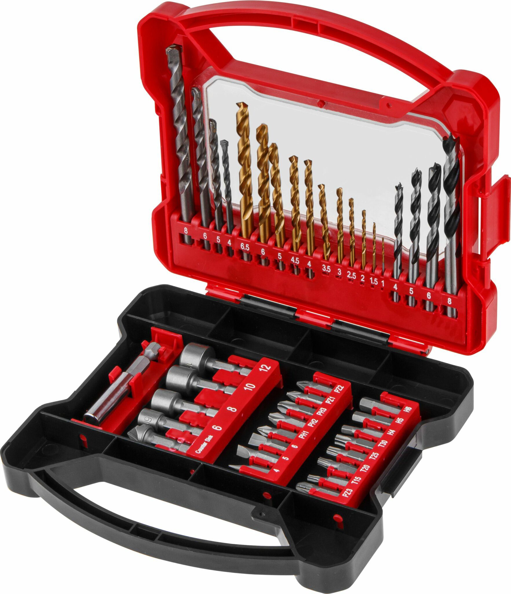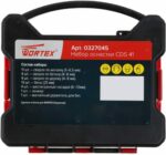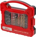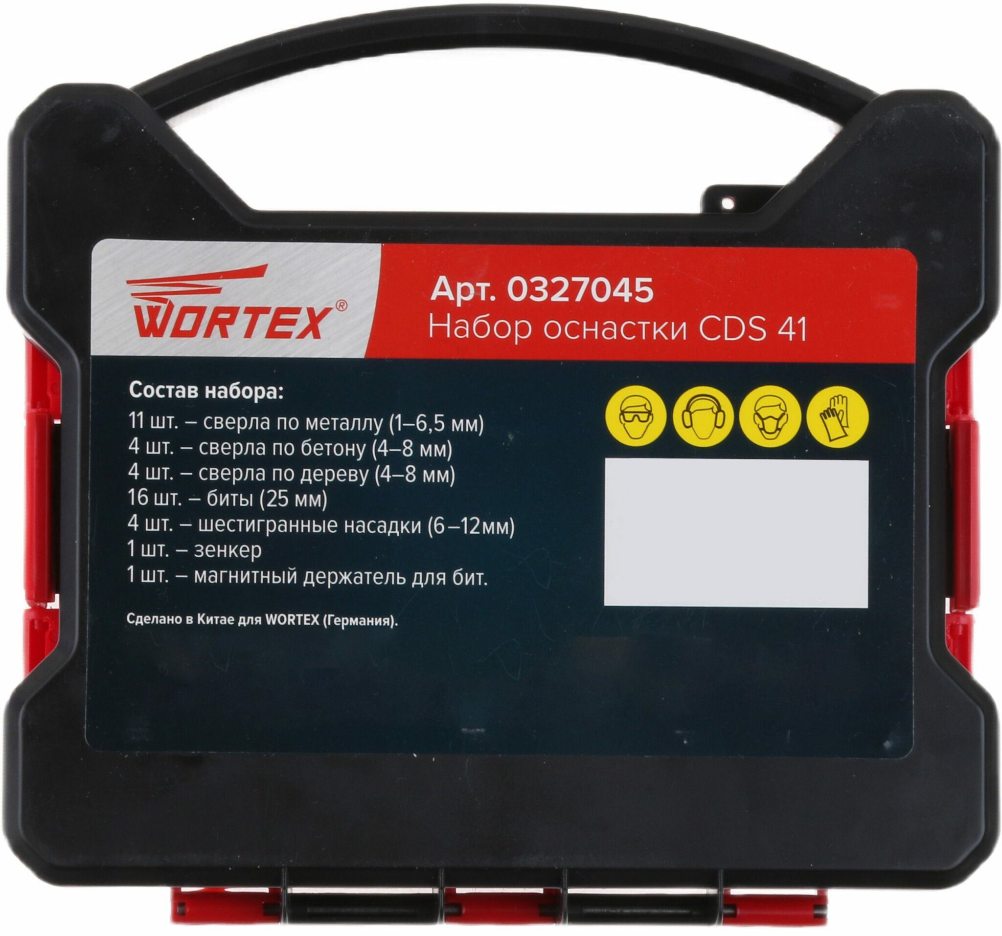 Набор оснастки WORTEX CDS 41 (0327045) состоит из 41 предметов в кейсе. В комплект входят 16 бит 25 мм, 4 шестигранные насадки 6-12 мм, 4 сверла по бетону и 4 сверла по дереву 4-8 мм, 11 сверл по металлу 1-6,5 мм, зенкер и магнитный держатель для бит.