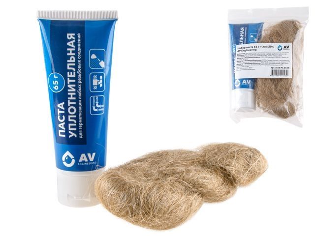 Паста уплотнительная AV ENGINEERING 65 г + лен 20 г (AVE-PL-6520) – готовый комплект для создания герметичных соединений в трубах и защите металл от коррозии. Паста легко наносится и не требует никаких дополнительных действий. Льняные волокна есть в комплекте.
