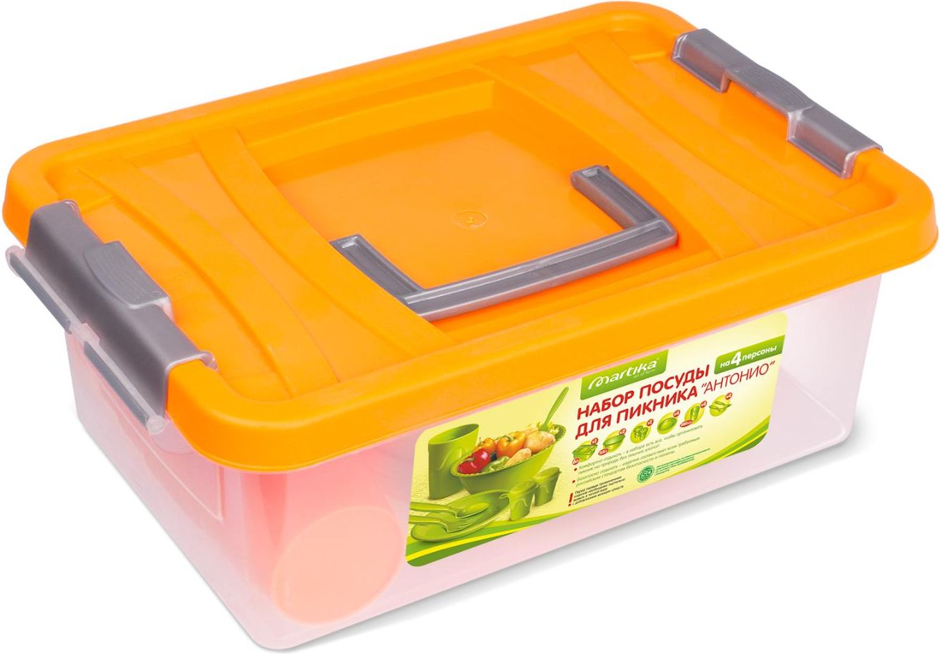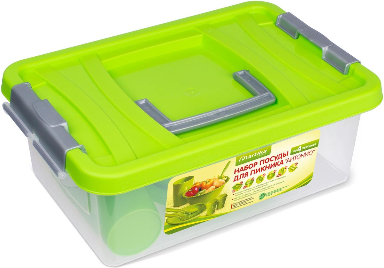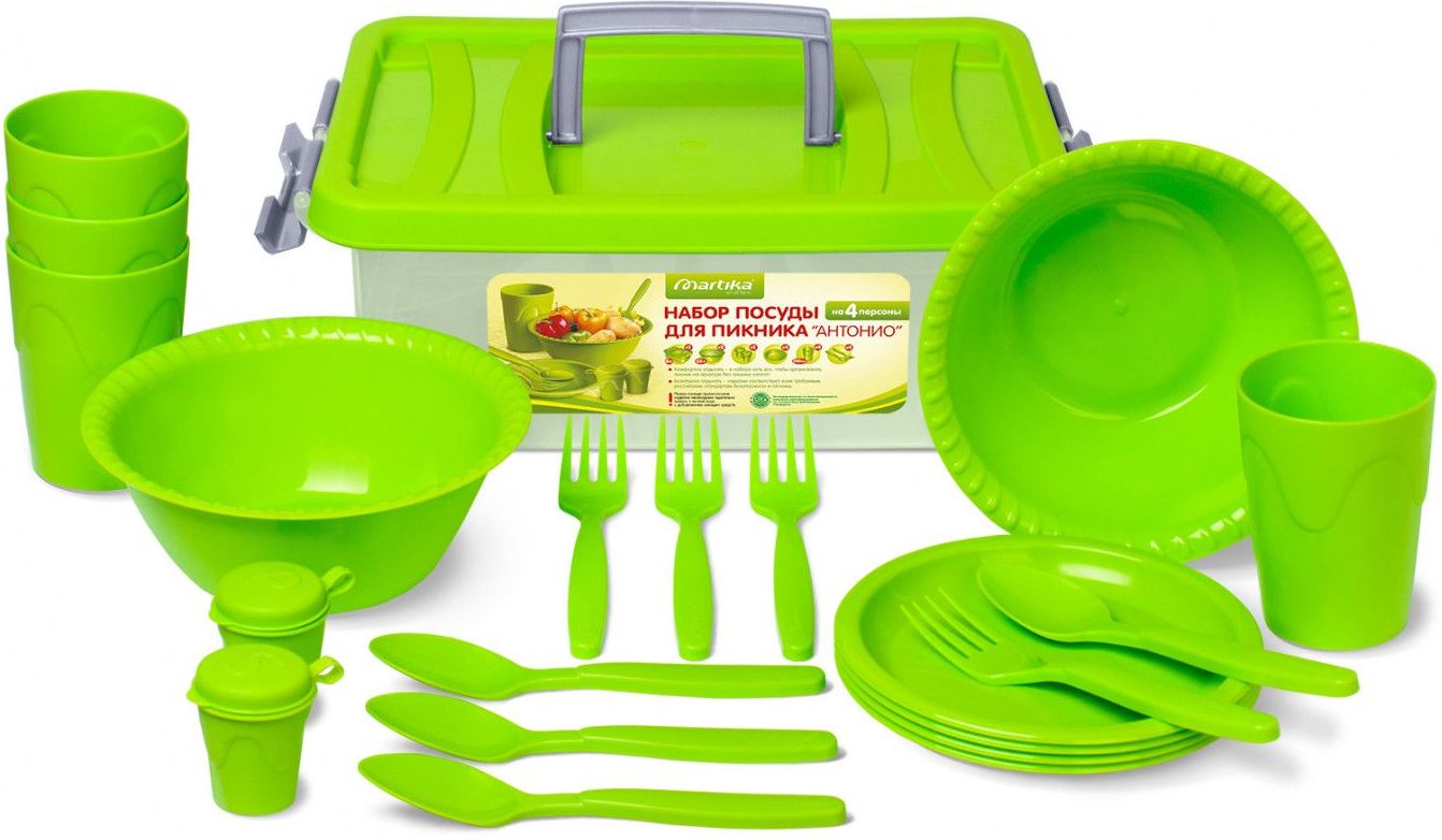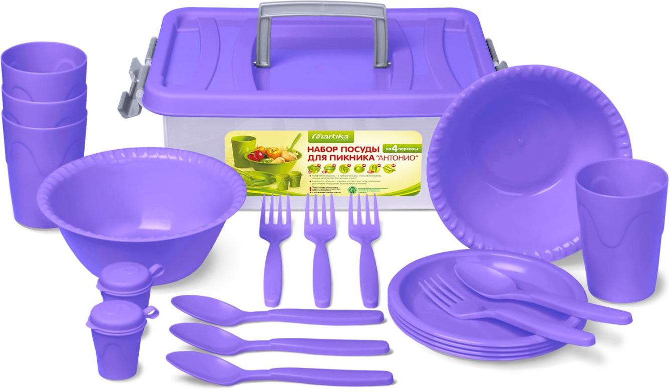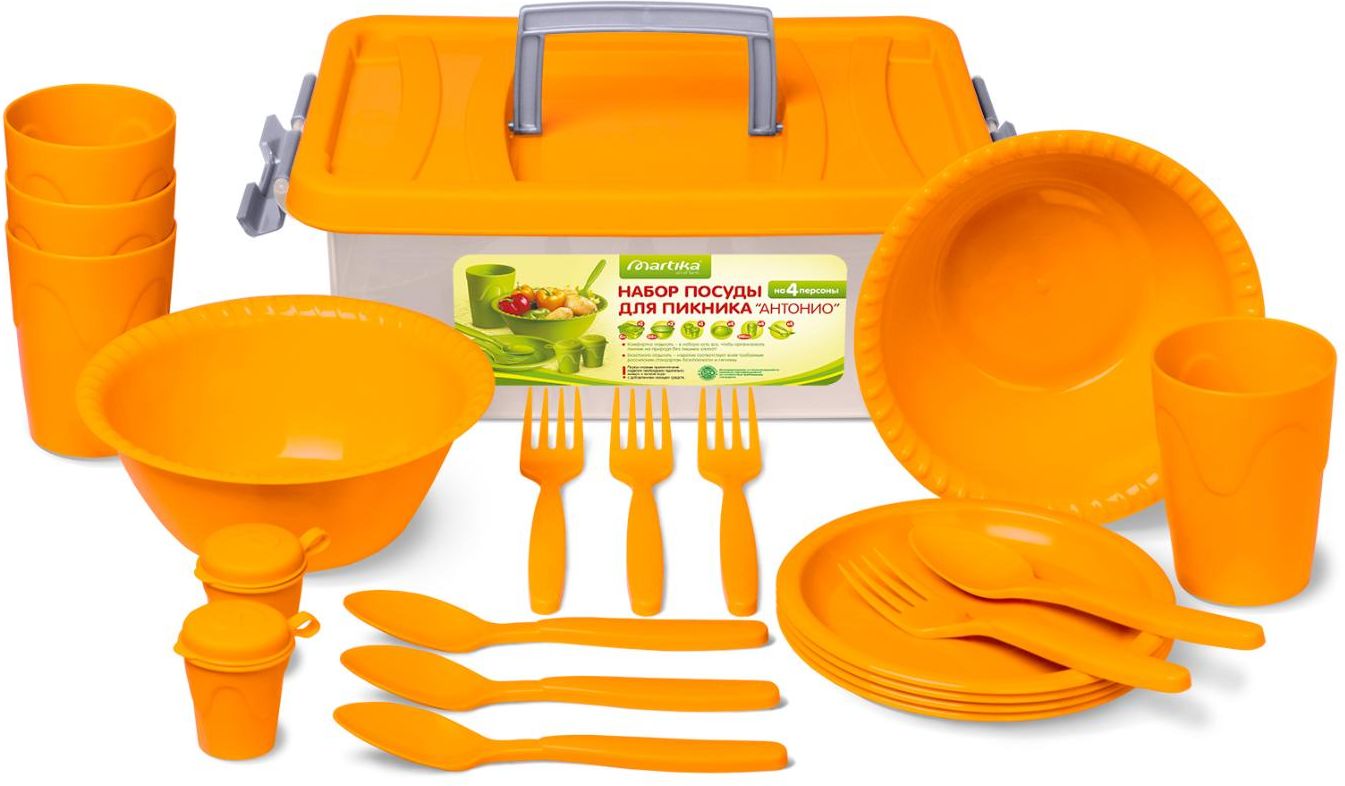Набор для пикника MARTIKA Антонио (С69) помещается в пластиковый контейнер объемом 6л и состоит из 20 предметов: миска-салатница 0,8 л (2 шт.), емкости для специй (2 шт.), тарелки для закусок (4 шт.), вилки (4 шт.), ложки (4 шт.), стаканы для холодных напитков (4 шт.) Материал: полипропилен.