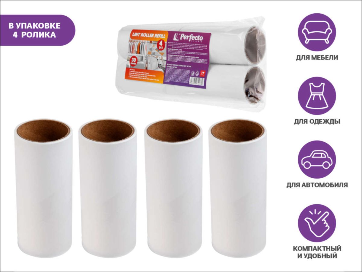 Сменный блок ролика для чистки одежды PERFECTO LINEA 4 штуки (45-103004) включает в себя 4 ролика по 30 отрывных листов каждый. Липкая поверхность эффективно удаляет пыль, волосы, шерсть и мелкий мусор с одежды, мебели и текстильных изделий. Листы легко снимаются, ролики компактны и удобны в использовании.