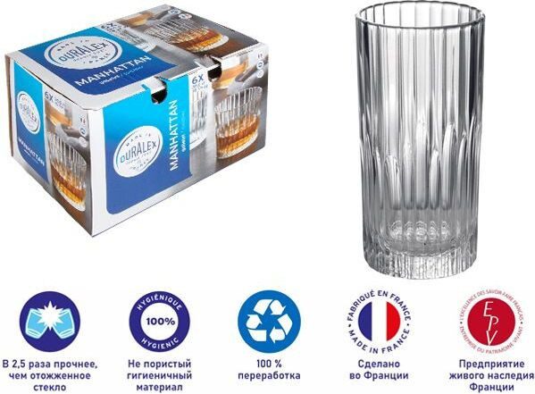 Набор стаканов DURALEX Manhattan 6 штук 300 мл (1058AB06A0111) выполнен из закаленного стекла, которое в 2,5 раза более устойчиво к механическим воздействиям. Стекло не впитывает запахи. Легко чистится.