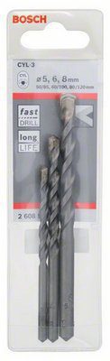 Набор сверл 3 предмета BOSCH CYL-3 (2608597709) предназначены для работы с бетоном и кирпичной кладкой. В состав набора входят сверла диаметром 5 мм, 6 мм, 8 мм.