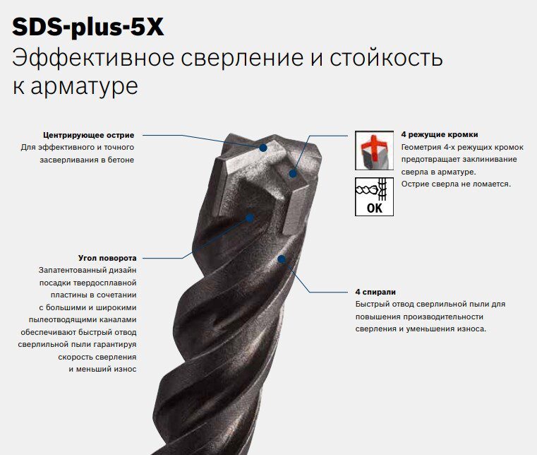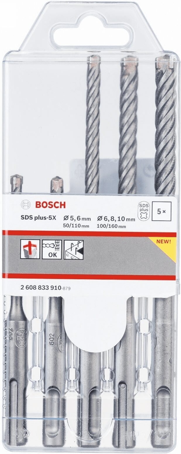 Набор буров (сверл) SDS-plus 5 шт BOSCH SDS-plus-5X (2608833910) включает сверла 5, 6, 6, 8, 10 мм, обеспечивающих высокоэффективное сверление железобетона. Наконечник с «углом поворота» и 4-канальная конструкция хорошо удаляют пыль, обеспечивая быстрое сверление с пониженным износом. Центрирующий наконечник направляет сверло для эффективного сверления отверстий в точности необходимого диаметра. PGM гарантирует соответствие жестким допускам, точности сверления отверстий и надежности установки крепежных деталей.