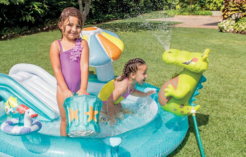 Водный игровой центр INTEX Крокодил 201х170х84 см (57165NP) отлично подойдет для детского отдыха на природе. Минимальный возраст малышей, для которых предназначен этот игровой центр, 2 года. Представляет собой неглубокий бассейн с горкой и навесом.Есть забавные надувные игрушки, надувное ведро для рыбалки, плавательное кольцо с уткой и забавный надувной крокодил, который может распылять воду, если к нему подключить шланг. Надувной гриб защитит от прямых солнечных лучей во время игр.