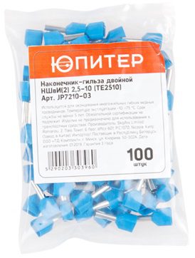 Кабельный наконечник двойной ЮПИТЕР НШвИ(2) 2,5-10 TE2510 100 штук (JP7210-03) предназначен для оконцевания методом опрессовки гибких многопроволочных проводников и является современной альтернативой обязательному обслуживанию многожильных проводников при присоединении к клеммам.