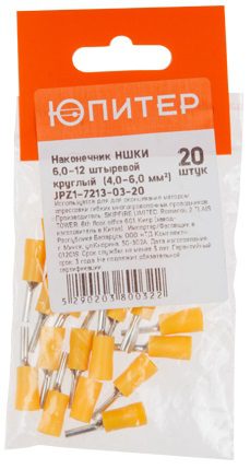 Кабельный наконечник ЮПИТЕР НШКИ 6,0-12 6,0 мм2 20 штук (JPZ1-7213-03-20) предназначен для оконцевания методом опрессовки гибких многопроволочных проводников и является современной альтернативой обязательному обслуживанию многожильных проводников при присоединении к клеммам.
