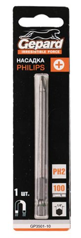 Бита для шуруповерта магнитная PH2 100 мм GEPARD (GP3501-10) применяется в качестве сменной насадки для работы с крепежом с крестовым шлицем стандарта Philips.