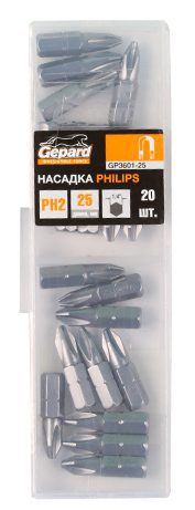Бита для шуруповерта магнитная PH2 25 мм 20 штук GEPARD (GP3601-25) применяется в качестве сменной насадки для работы с крепежом с крестовым шлицем стандарта Philips.