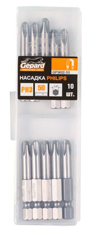 Бита для шуруповерта магнитная PH2 50 мм 10 штук GEPARD (GP3601-50) применяется в качестве сменной насадки для работы с крепежом с крестовым шлицем стандарта Philips.