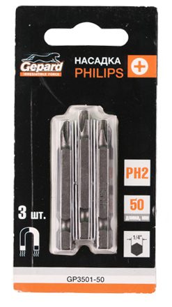 Бита для шуруповерта магнитная PH2 50 мм 3 штуки GEPARD (GP3501-50) применяется в качестве сменной насадки для работы с крепежом с крестовым шлицем стандарта Philips.