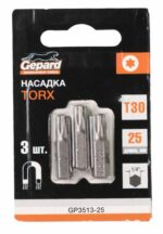 Бита для шуруповерта магнитная Torx T30 25 мм 3 штуки GEPARD (GP3513-25) используется в качестве сменной насадки при работе с крепежом, имеющим углубление стандарта Torx.
