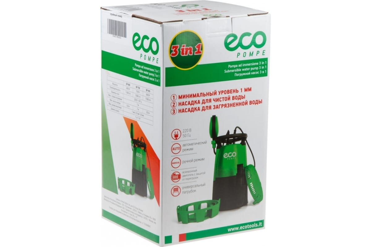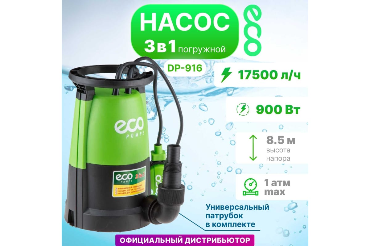 Насос дренажный 3-в-1 ECO DP-916i (EC4210-2) – многофункциональный погружной насос с возможностью установки сменных насадок, позволяющих использовать его в различных ситуациях. Максимальная температура перекачиваемой воды +35 °С.