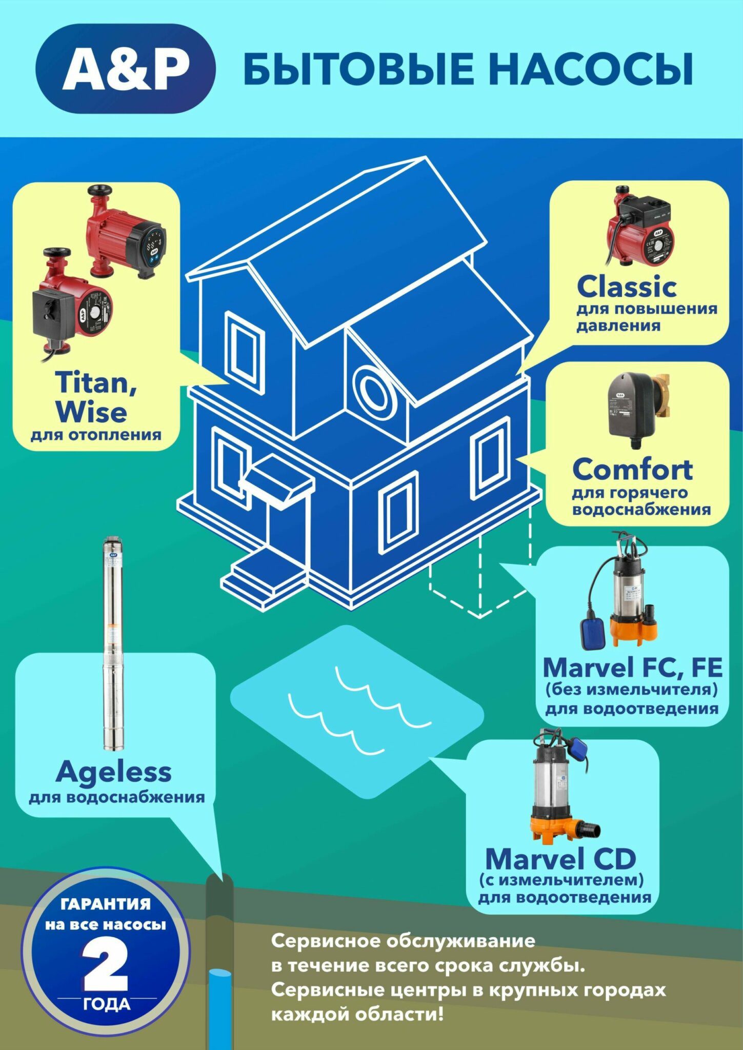 Насос фекальный A&P Marvel 800 FE 250/10 (AP02A05) – аппарат для выкачивания загрязненной воды с содержанием твердых частиц диаметром до 25 мм. Забор воды производится через всасывающие отверстия в нижней части насоса. Для обеспечения наилучшего результата насос должен находиться в жидкости в вертикальном положении, полностью погруженным в воду. Не допускается установка насоса на илистое дно резервуара – в данном случае необходимо подвесить насос во избежание засасывания ила.