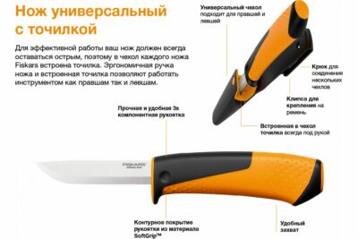 Нож общего назначения FISKARS с точилкой (1023618) подойдет для широкого спектра работ. Эргономичная рукоятка с шероховатой нескользящей поверхностью обеспечивает эффективный захват и безопасную работу инструментом. Чехол для ножа оснащен встроенной и простой в использовании точилкой, он подходит для правшей и левшей. Лезвие из нержавеющей стали прослужит долгие годы.