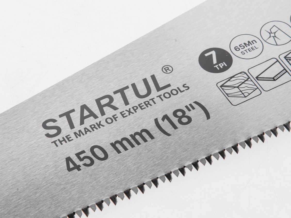 Ножовка по дереву 450 мм 7 TPI STARTUL Master (ST4242-45) предназначена для продольного и поперечного пиления древесины. У неё 7 зубьев на дюйм, калёные зубья с трёхгранной заточкой, полотно из инструментальной углеродистой стали 65Mn и сухое антикоррозийное покрытие. Рукоятка двухкомпонентная, ударопрочная и обрезиненная, крепится к полотну тремя винтами.