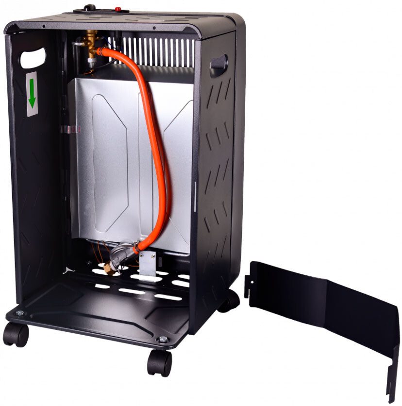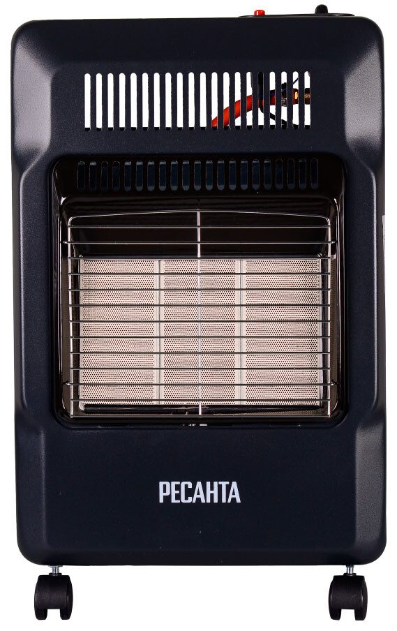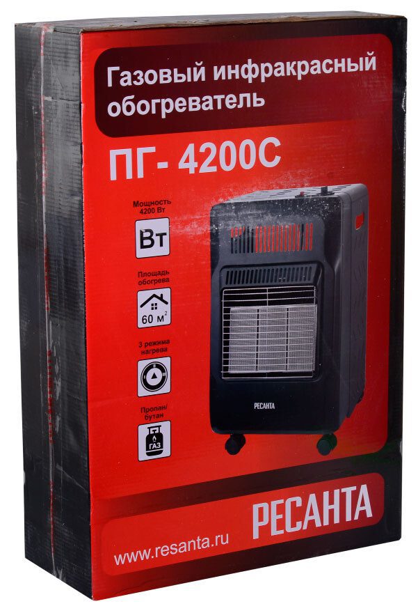 Обогреватель инфракрасный газовый РЕСАНТА ПГ-4200С (67/5/12) – работает на газовом топливе. Теплоотдача осуществляется преимущественно инфракрасным излучением. Данный газовый обогреватель безопасен, эффективен и надежен. Для работы в нём используется исключительно сжиженный газ (пропан, пропан-бутан). Емкости для газа поставляются отдельно. Обогреватель оснащён следующими системами безопасности: автоматическое отключение, если внезапно погаснет фитиль, автоматическое отключение при опрокидывании (в этом случае верните нагреватель в вертикальное положение, проверьте на наличие возможных повреждений и подождите 5-10 минут перед повторным зажиганием), автоотключение при получении ударов, автоматическое отключение, когда концентрация углекислого газа СО² в воздухе помещения достигает 0,8-1,5%. Способ поджига – пьезо. Место под установку баллона внутри устройства – 12 л.
