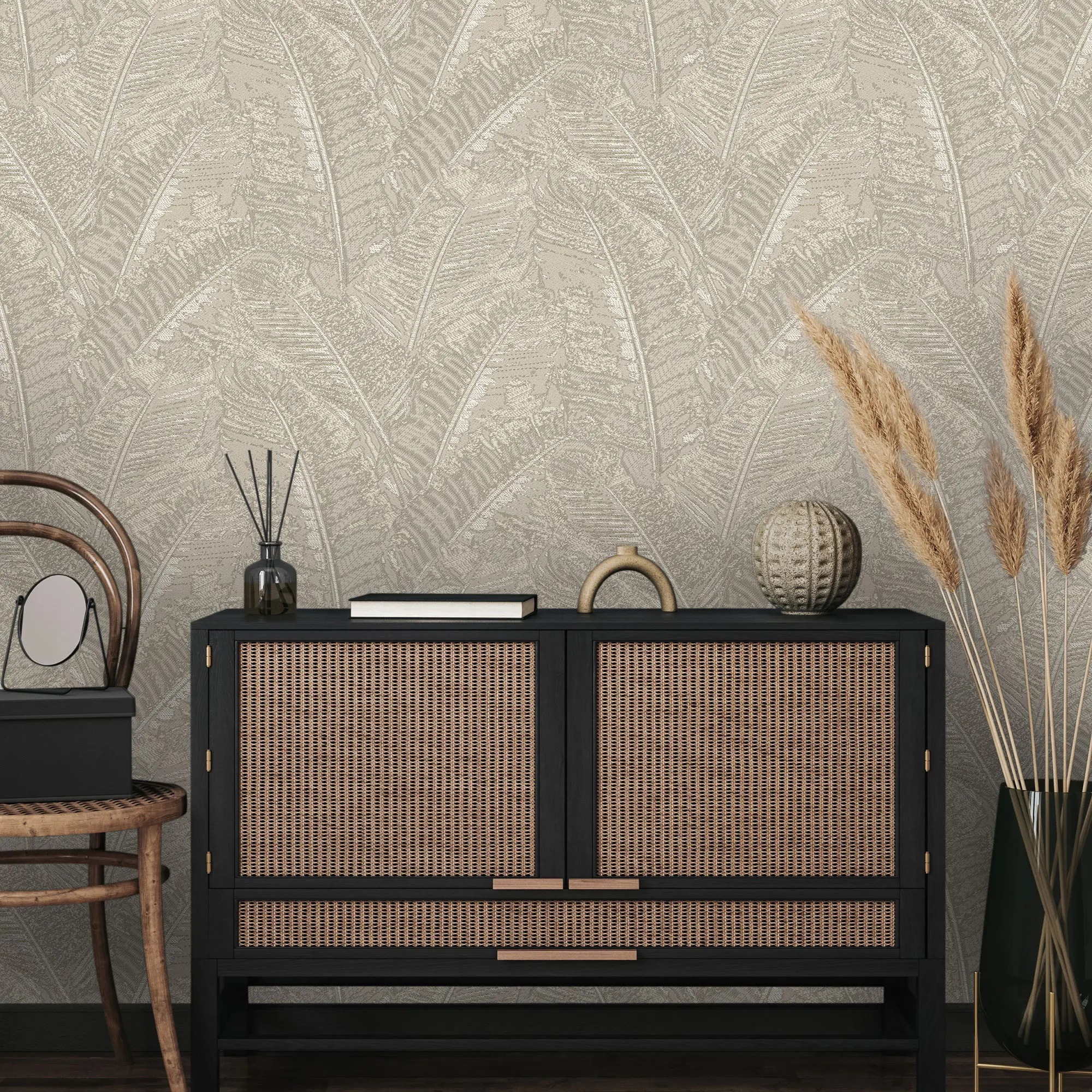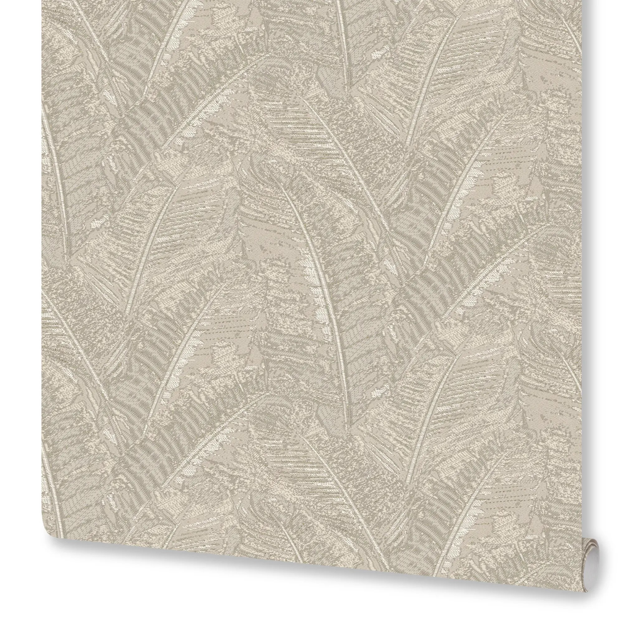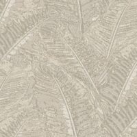 В мотиве представлены крупные листья папоротника. Хаотично раскинувшиеся на полотне, они переплетаются и накладываются друг на друга, образуя многоуровневый рисунок, благодаря чему вся композиция выглядит объемной. Разностороннее тиснение придает растениям естественную природную текстуру. Их стебли выделены контрастным оттенком, а прожилки дополнительно подчеркнуты искрящимся разноцветным глиттером. Создается ощущение, будто капли росы на листьях играют и блестят под ярким солнышком, а вкрапления металлика и переливающегося перламутра усиливают этот эффект. Фон коллекции «Fern» выполнен в спокойных пастельных тонах и имитирует текстуру рогожки, покрытую перламутром. Такое решение поддерживает основной мотив и придает всей коллекции атмосферу уюта и комфорта.